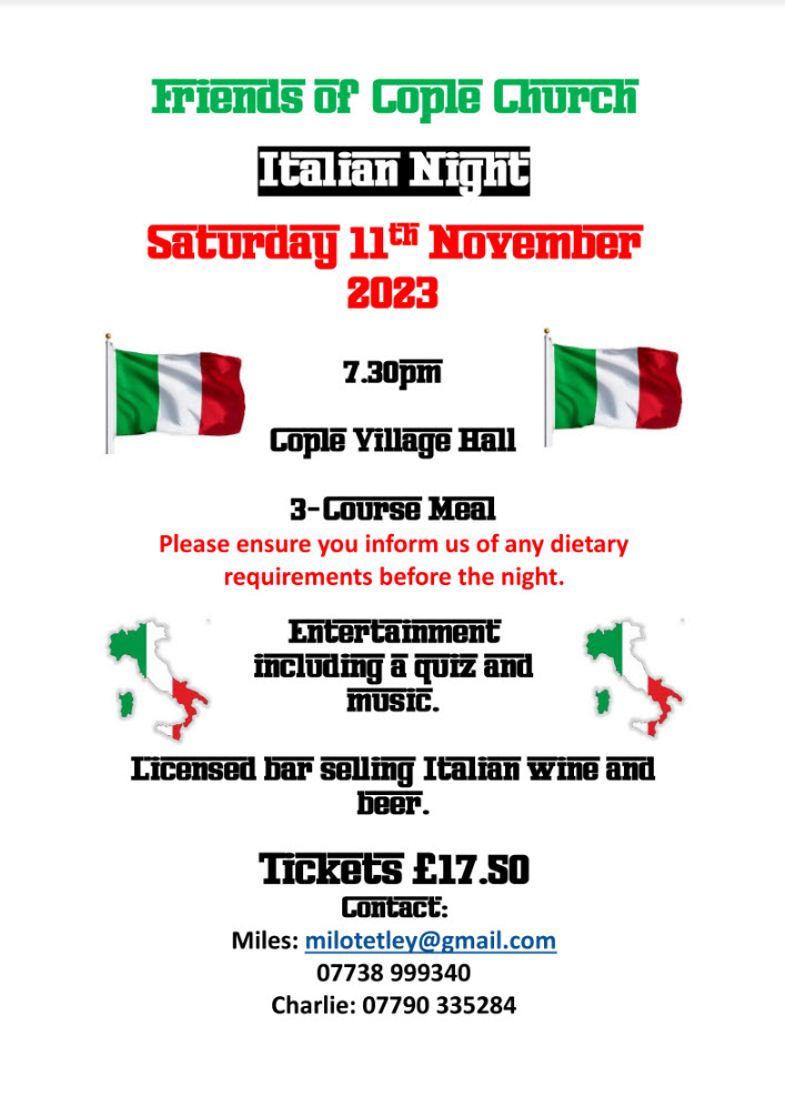 This page lists events that will be local to Cople. Local includes Willington, Cardington, Moggerhanger, Northill and Ickwell. I will consider further afield for special events and those that have a connection with Cople.